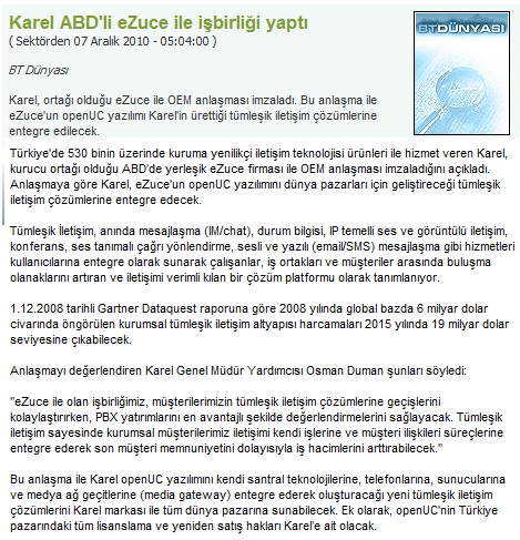 BT Dünyası - 08.12.2010 - Karel, ABD`li eZuce ile işbirliği yaptı