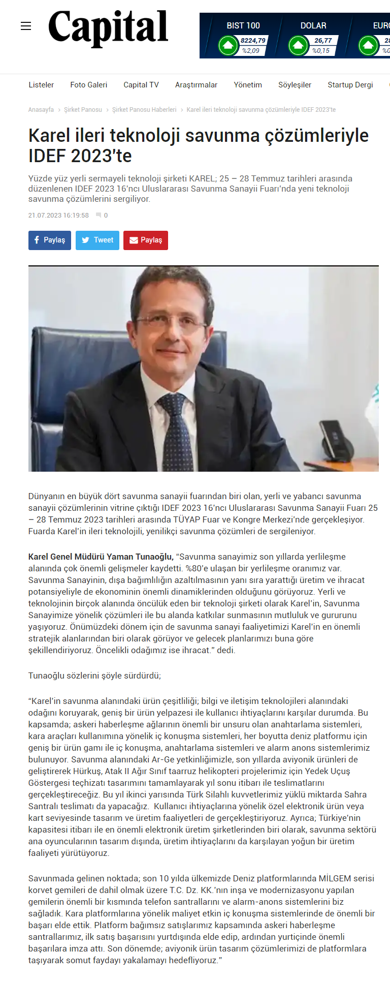 Capital - 25.07.2023 - Karel Ileri Teknoloji Savunma Çözümleriyle Idef 2023'Te
